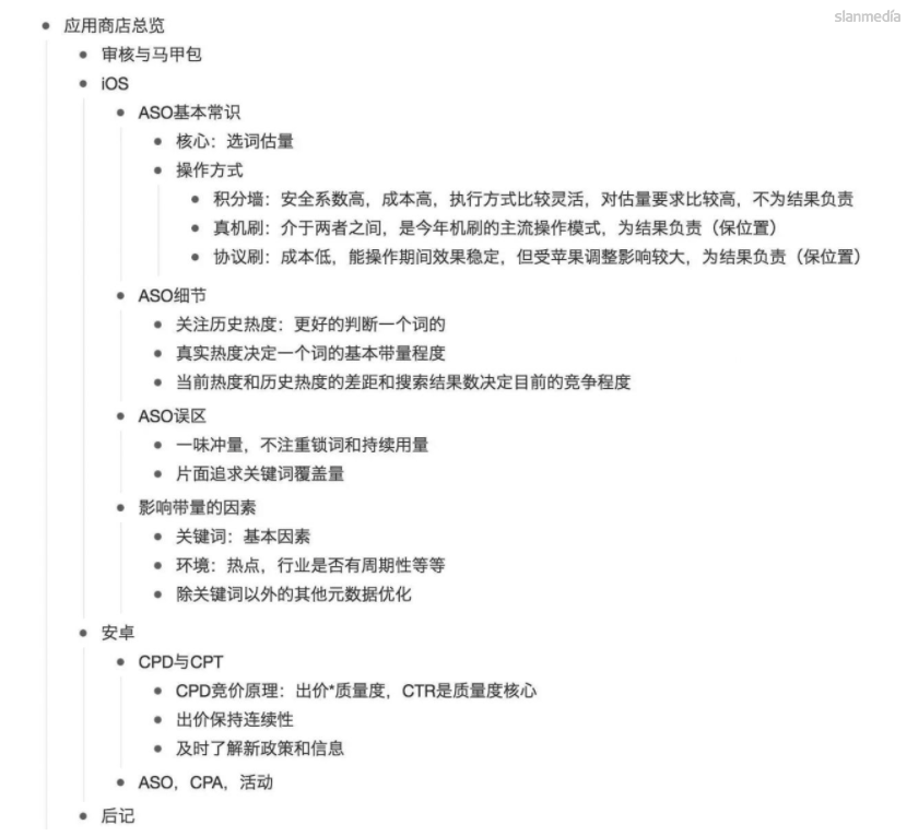 应用商店的流量基本由榜单、关键词、推荐(安卓商店各种首发、banner、角标其实都是推荐位)、活动构成。苹果商店暂时没有商业化,主要优化手段是关键词优化,榜单优化。安卓商店商业化比较成熟,优化手段主要是是官方售卖的CPD、CPT,前期也可以通过技术手段做一些关键词优化。