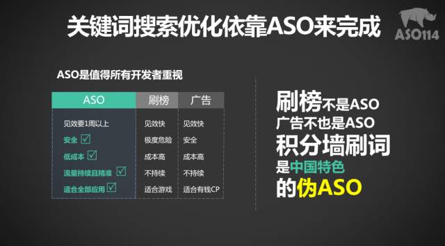 大部份人对ASO都有错误的认知,其实ASO的方法优化排名和直接刷榜有着本质上的区别,事实上,ASO不能单纯叫做App Store Optimization,ASO是移动端基于App的搜索优化,所以ASO准确的定义应该是App Search Optimization,应用搜索的优化。ASO的核心是关键词策略,所以不论是刷榜,还是通过广告或者积分墙,都不能算作是ASO。