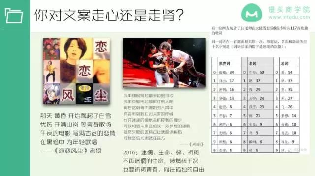 汪峰的歌词,就是青春、孤独、坚强、迷茫这些关键词,但你不会有很深刻的内心感觉,听过了就听过了,很难被这样的歌词打动,这样像我们平时做的一些文案,已经有了套路。这种文案是不会打动用户的。