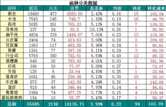 点评:如果你对账户中的计划和单元进行了一个病种标注,那这份数据是很容易实现出来的。某个病种每天消费多少?点击多少?转化多少?当领导这样问你的时候,你不要才想着去统计这份数据,这份数据不是做给领导看的,而是自己在分析账户时,真正需要去认真看待的一份数据。