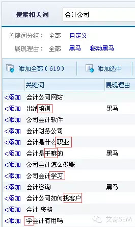 1.利用关键词工具查找否定词。这是最好也是效率较高的一种办法。将种子词放到关键词工具里面搜索推荐,查看推荐出来的词,其中有一批是与业务不相关的词。我们就可以将这些词的[中心词]部分添加为否定词。注意,添加否定词一定要否到词的利害点上。如图:一家做会计代理的公司,就应当把“培训”、“学”等词添加为否定词。